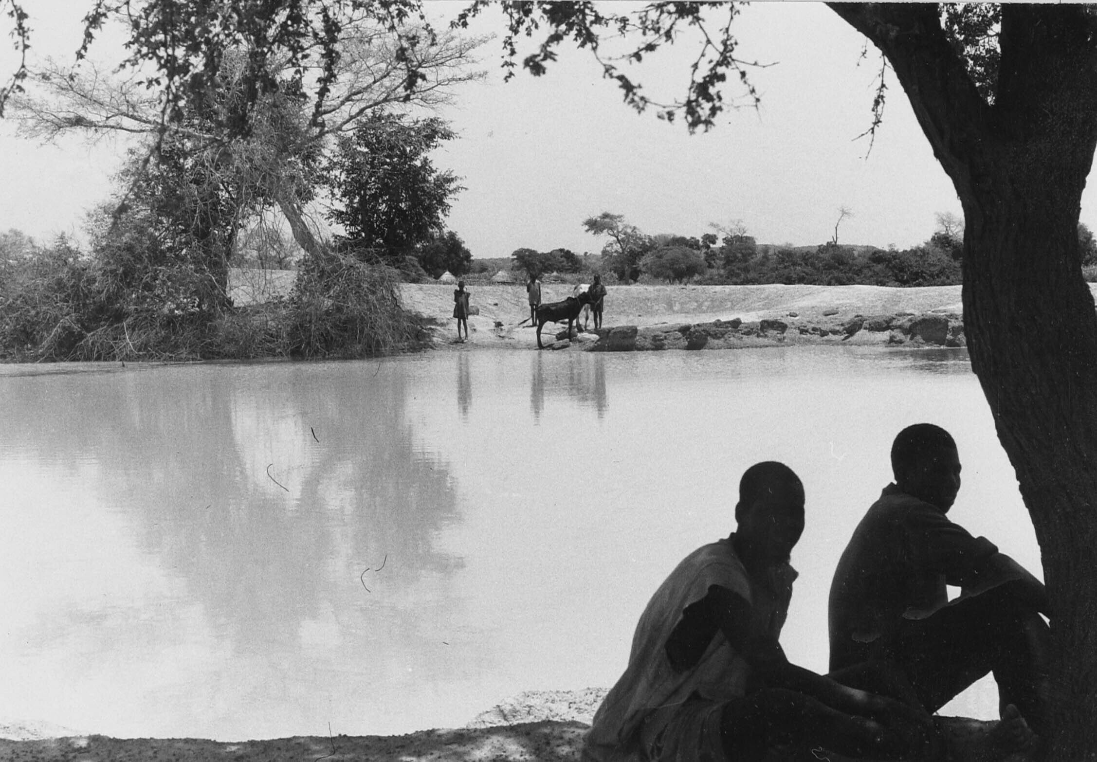Jongens aan de oever van een vijver die gebruikt wordt als drinkplaats voor het vee