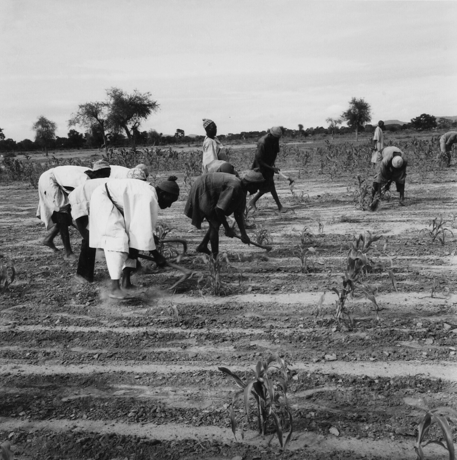 Tussen de plantrijen wordt de schoffel getrokken door een ezel.Rijen zelf wordt met de hak geschoffeld