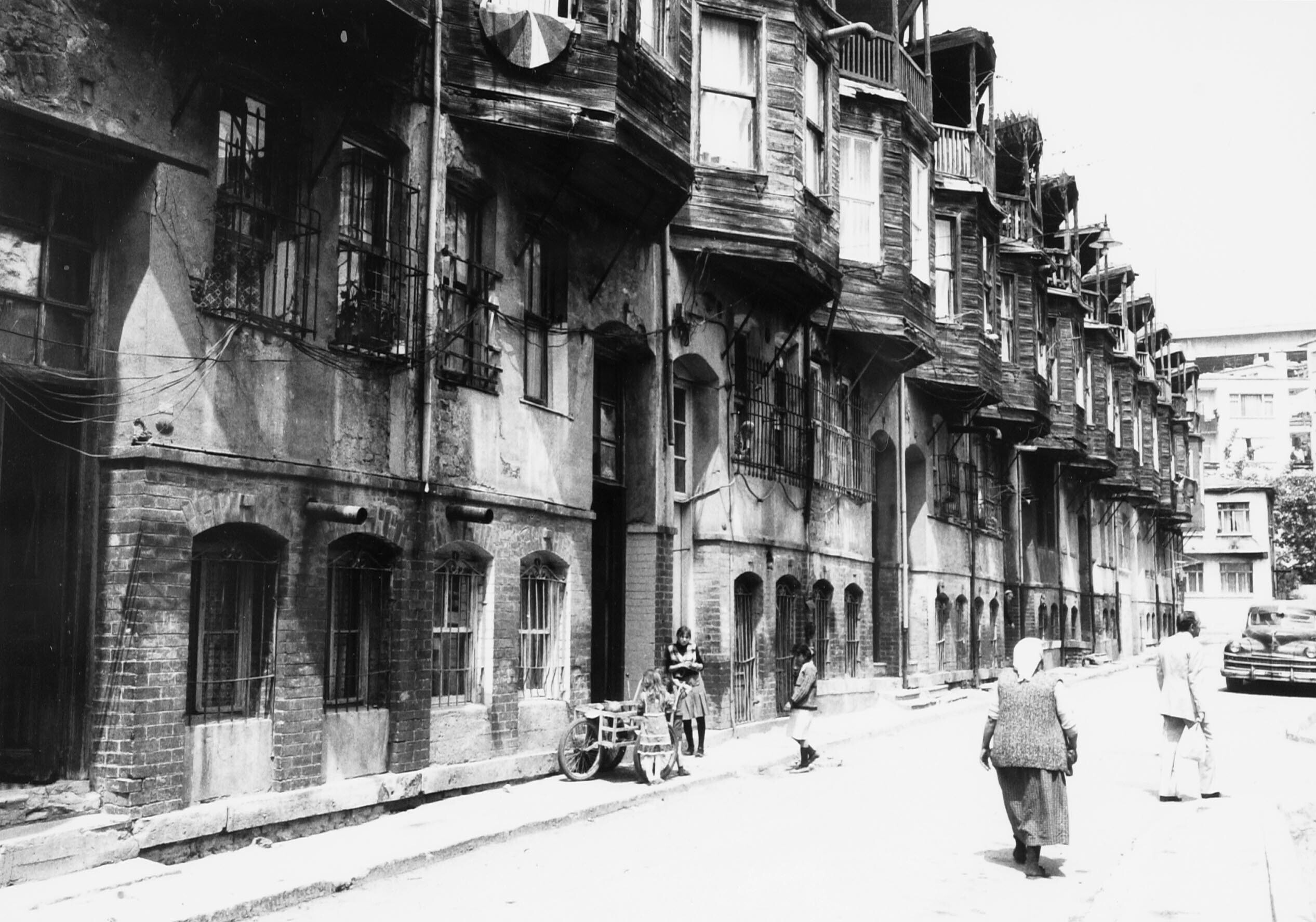 Rijen Joodse huizen gebouw rond 1900 in de wijk Ortakay in Istanboel, bewoond door Turken