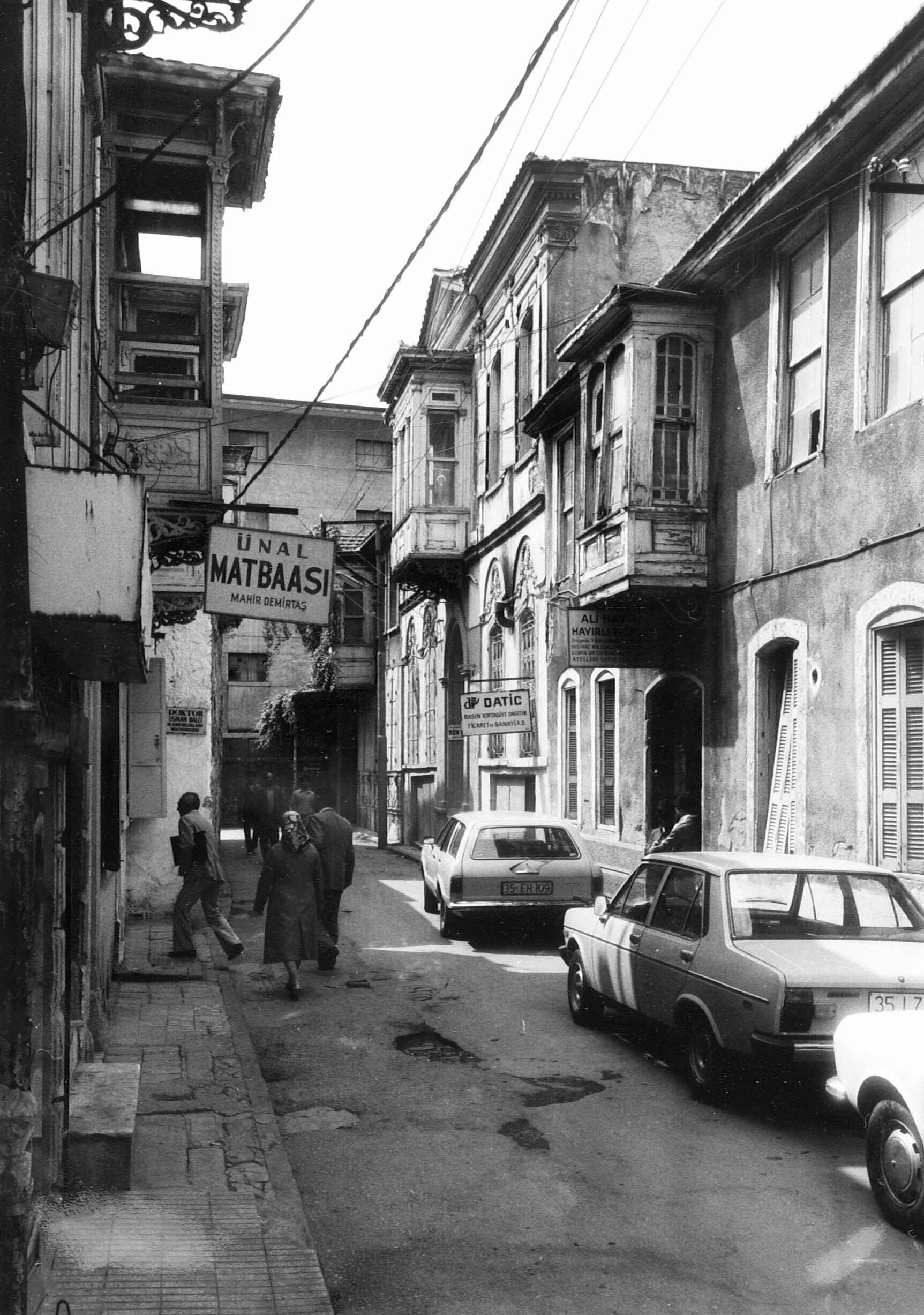 Izmir, straatbeeld. Met rechts-achter een huis met Griekse invloed, in de gevel.