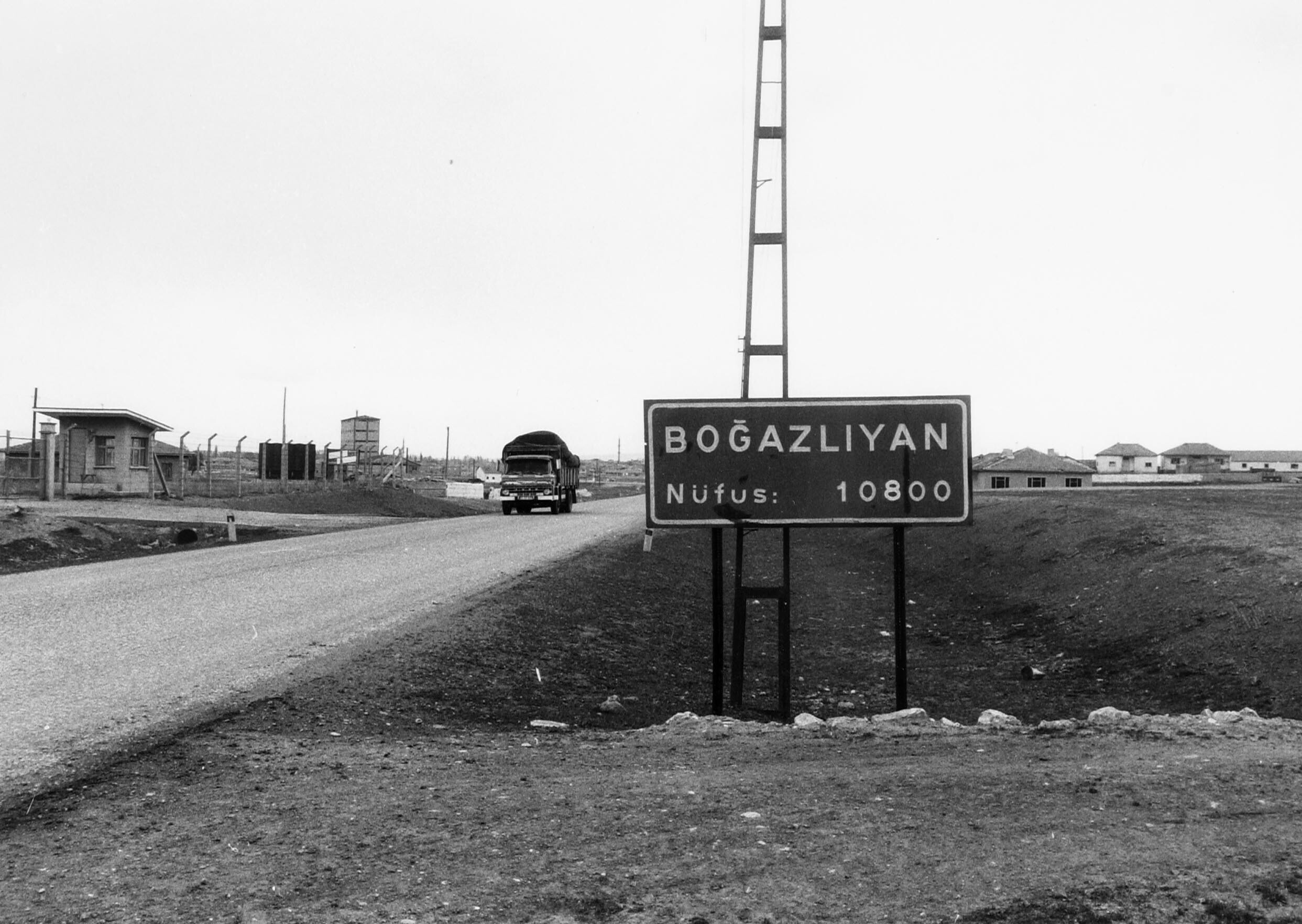 Het naambord aan het begin van het dorp Bogazliyan met daarop vermeld het aantal inwoners.