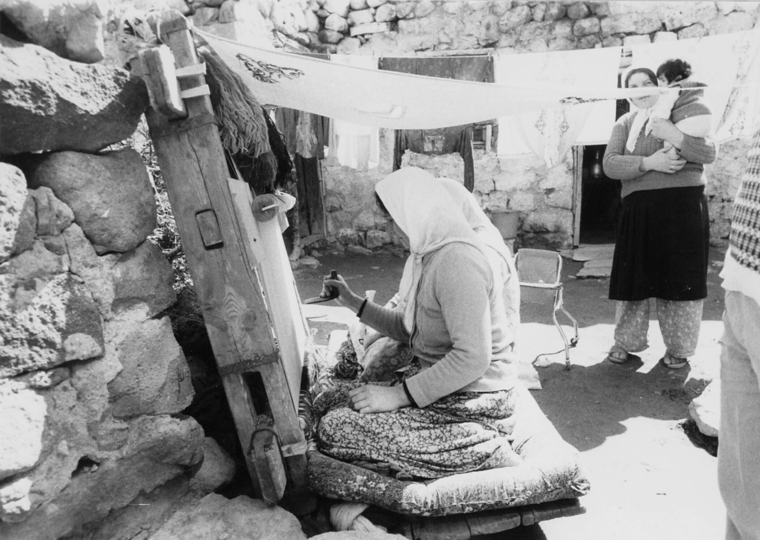 Hacilar. Vrouwen die een tapijt zitten te knopen in de buitenlucht. Het aandrukken van de knopen