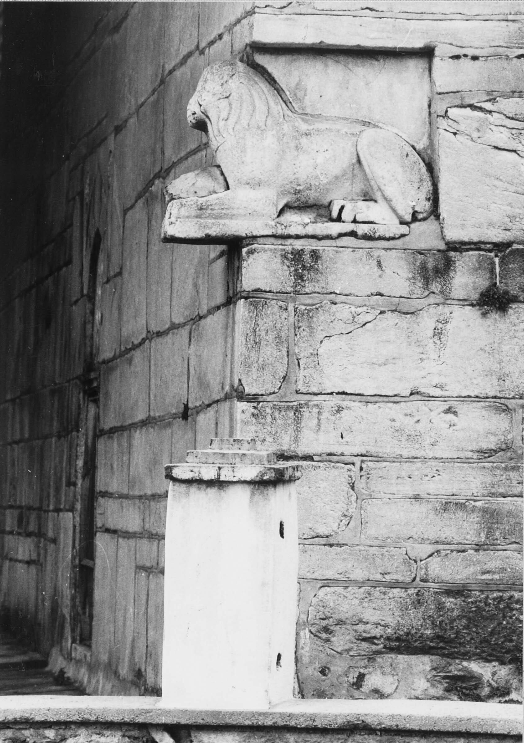 Een marmeren leeuw uit de tijd van Alexander de Grote ingemetseld op een van de hoeken van de moskee in het dorp Birgi nabij Izmir.