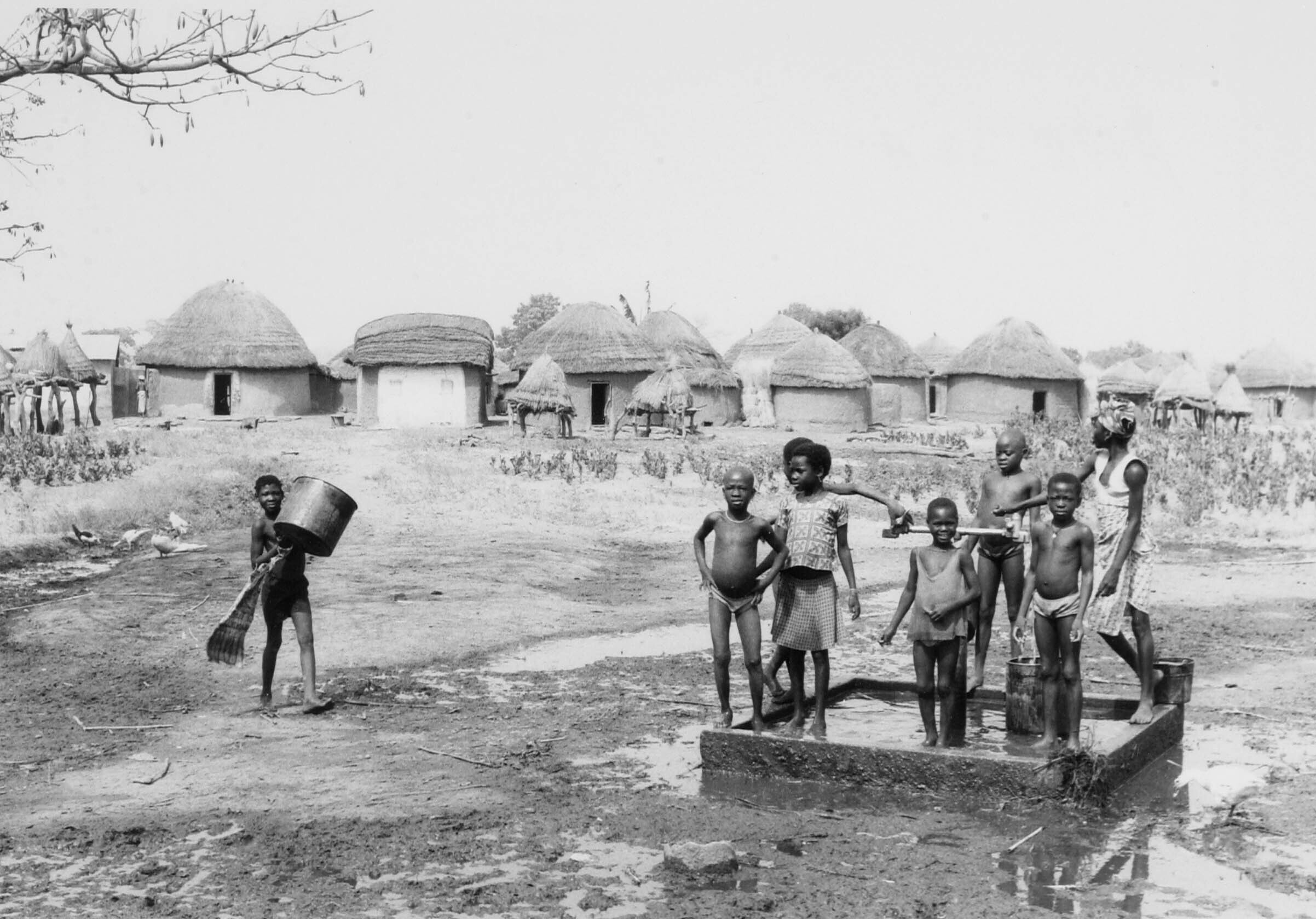 Kinderen aan de waterkraan in een dorpje aan de Witte Volta rivier, Northern Region