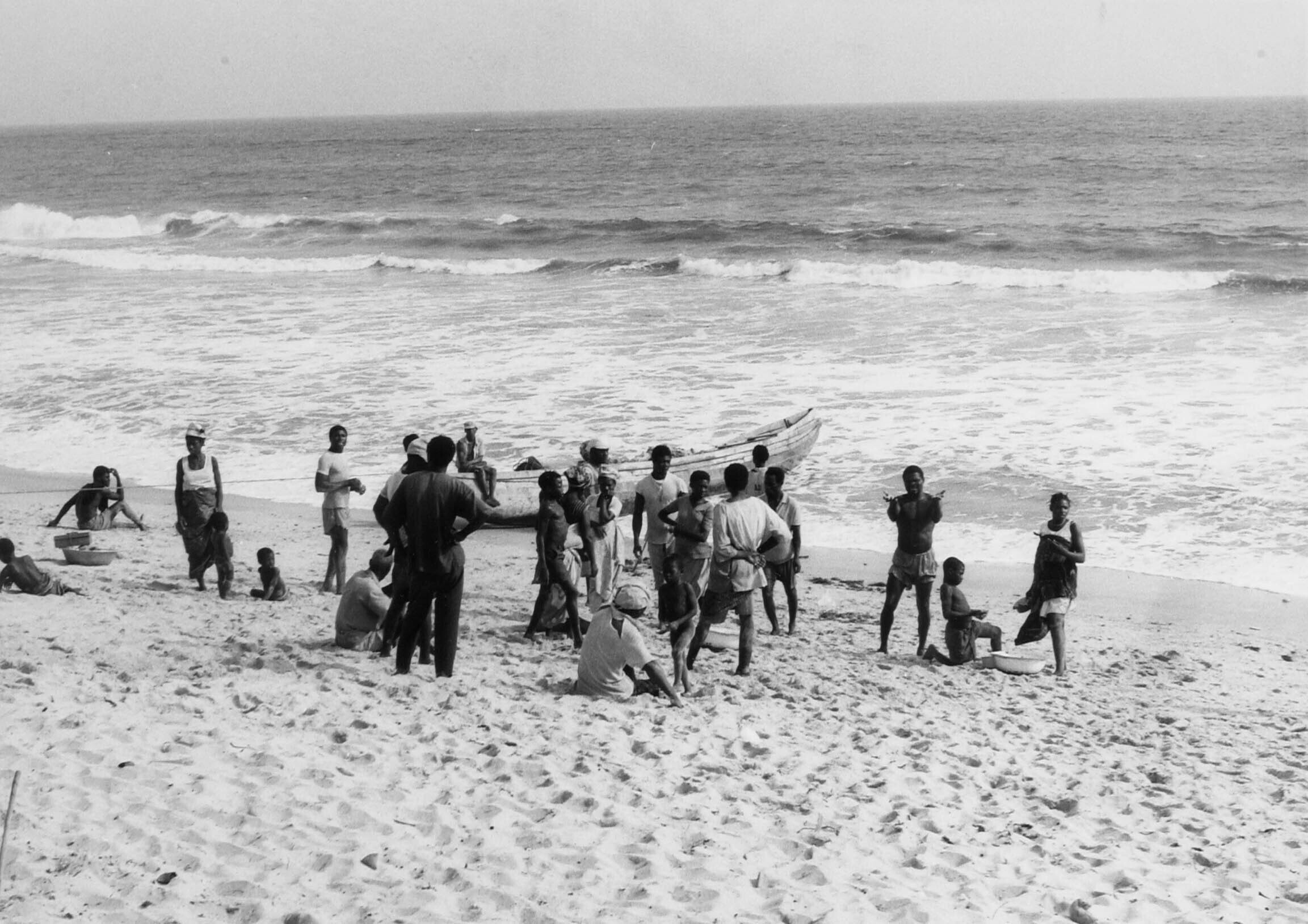 Vissersfamilie op het strand tussen Accra en Tema