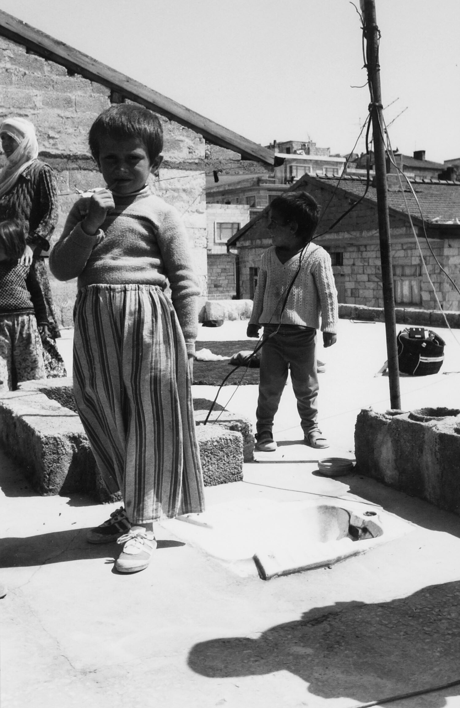 Kinderen op dakterras, waar een wc pot is ingemetseld met afvoer naar benlen