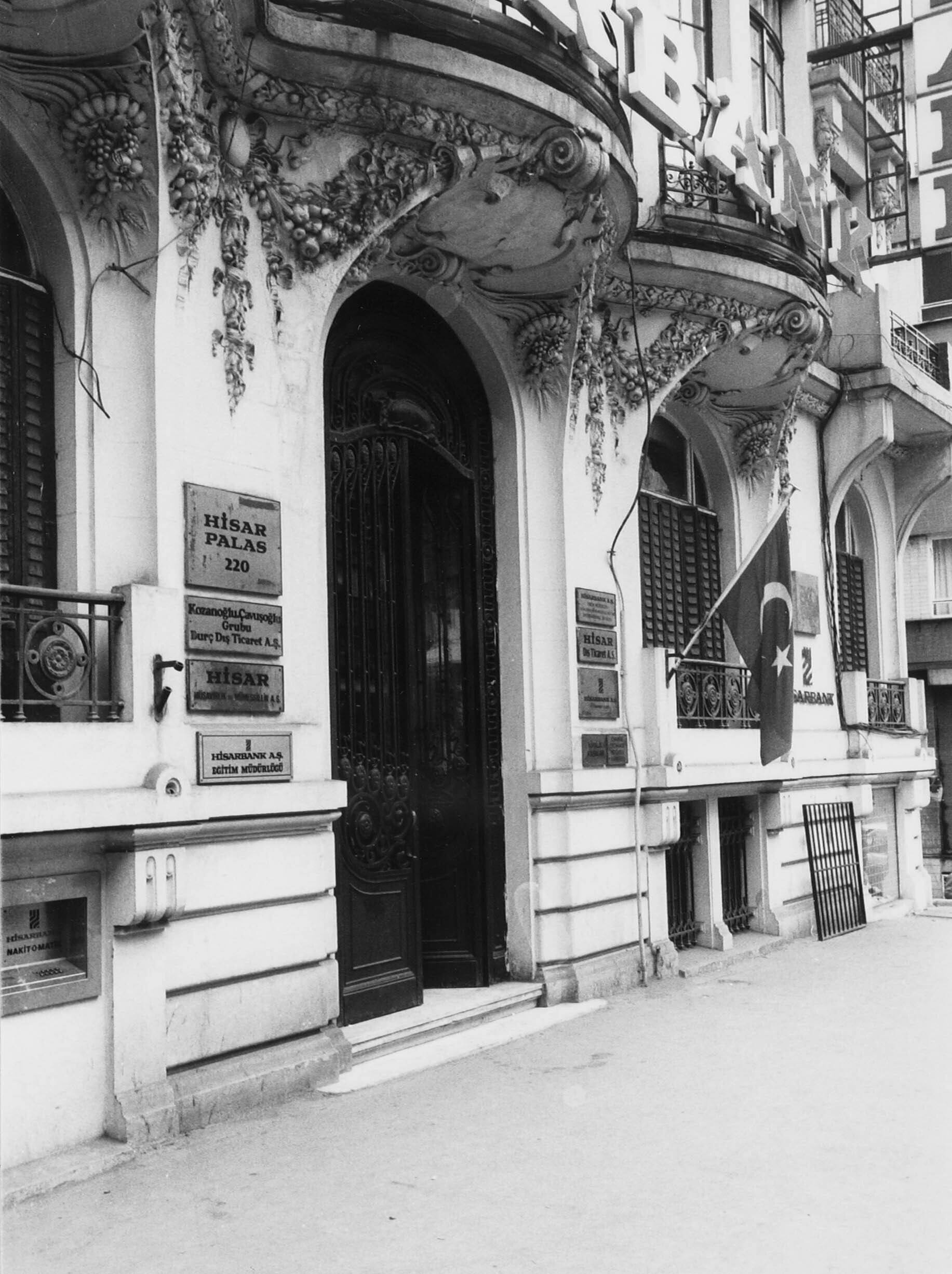 Barokke versieringen op de ingang van de Hisar Bank in de stadswijk Cumhuriyet