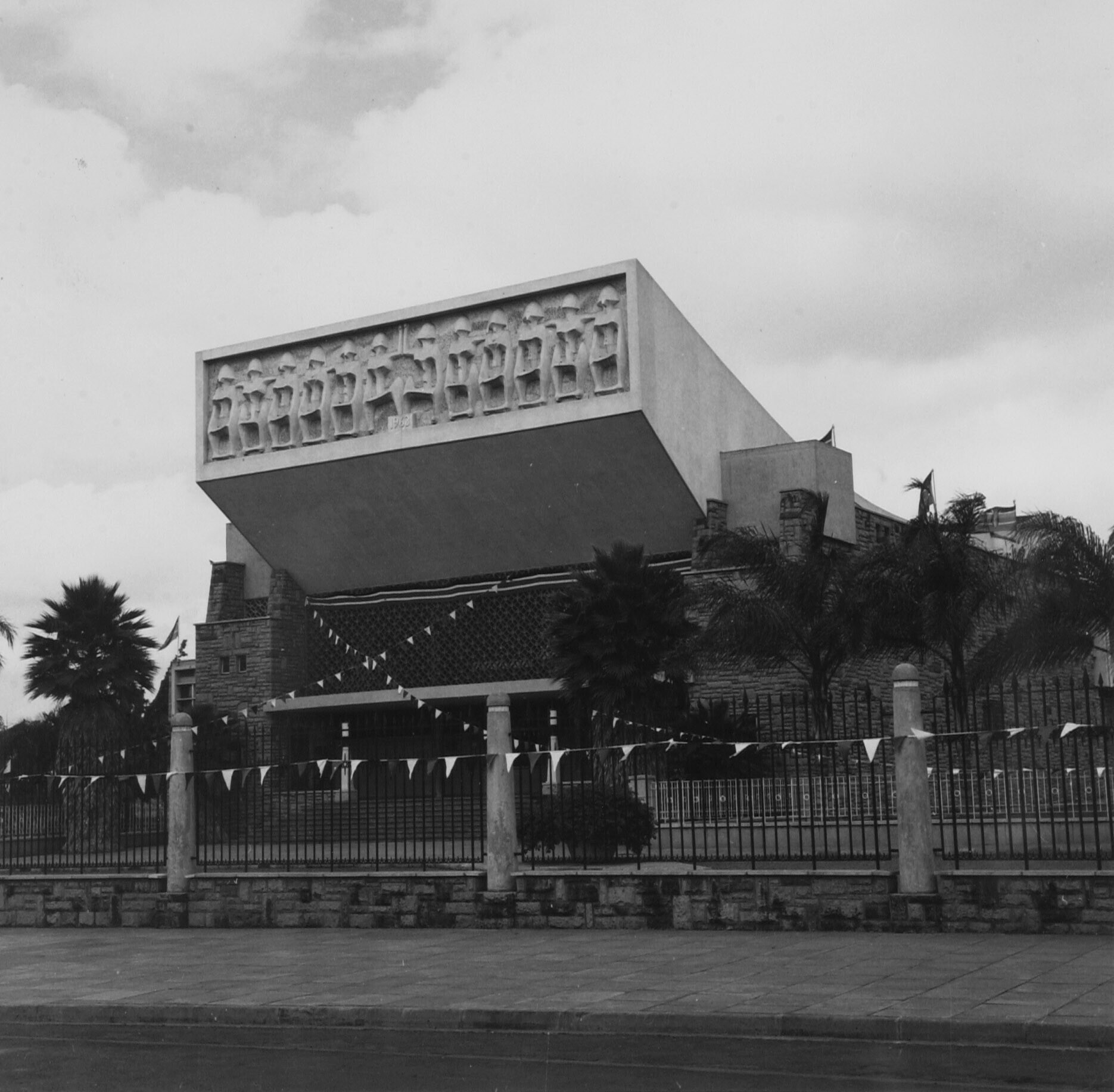 Een van de parlementsgebouwen in Nairobi met vlaggetjes versierd ter gelegenheid van tien jaar onafhankelijkheid van Kenya
