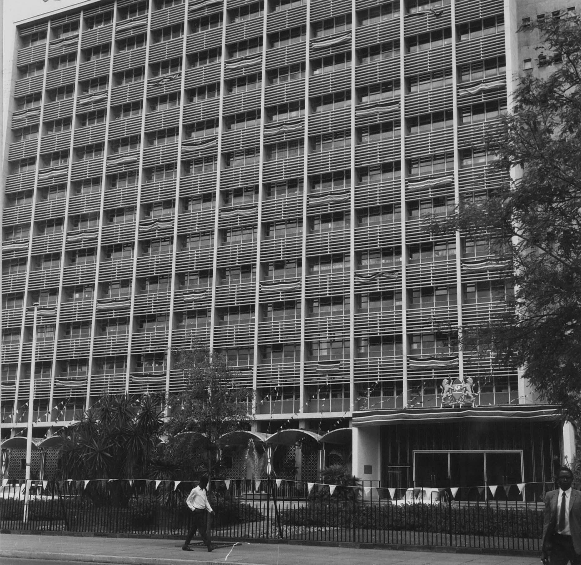 Het presidentieel kantoor 'Office of the President' in Nairobi met vlaggen versierd ter gelegenheid van tien jaar onafhankelijkheid van Kenya