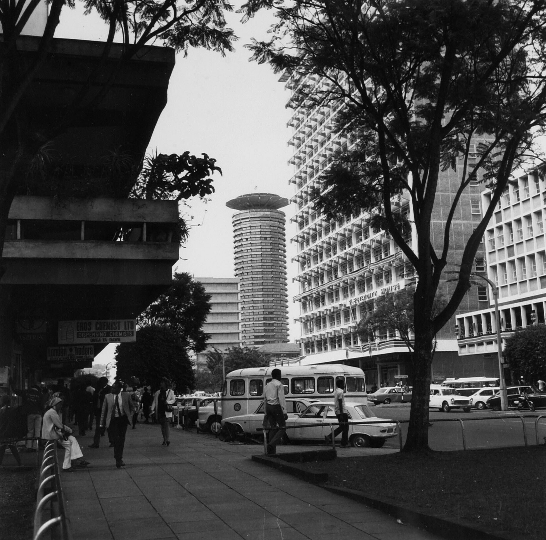 Straatgezicht in Nairobi met op de achtergrond het Kenyatta International Conference Centre (K.I.C.C.)