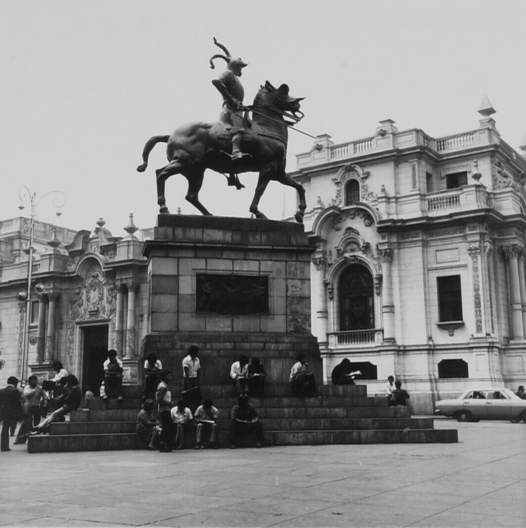 De Plaza de Armas in Lima. Standbeeld van Pizarro. Op de achtergrond het presidentieel paleis