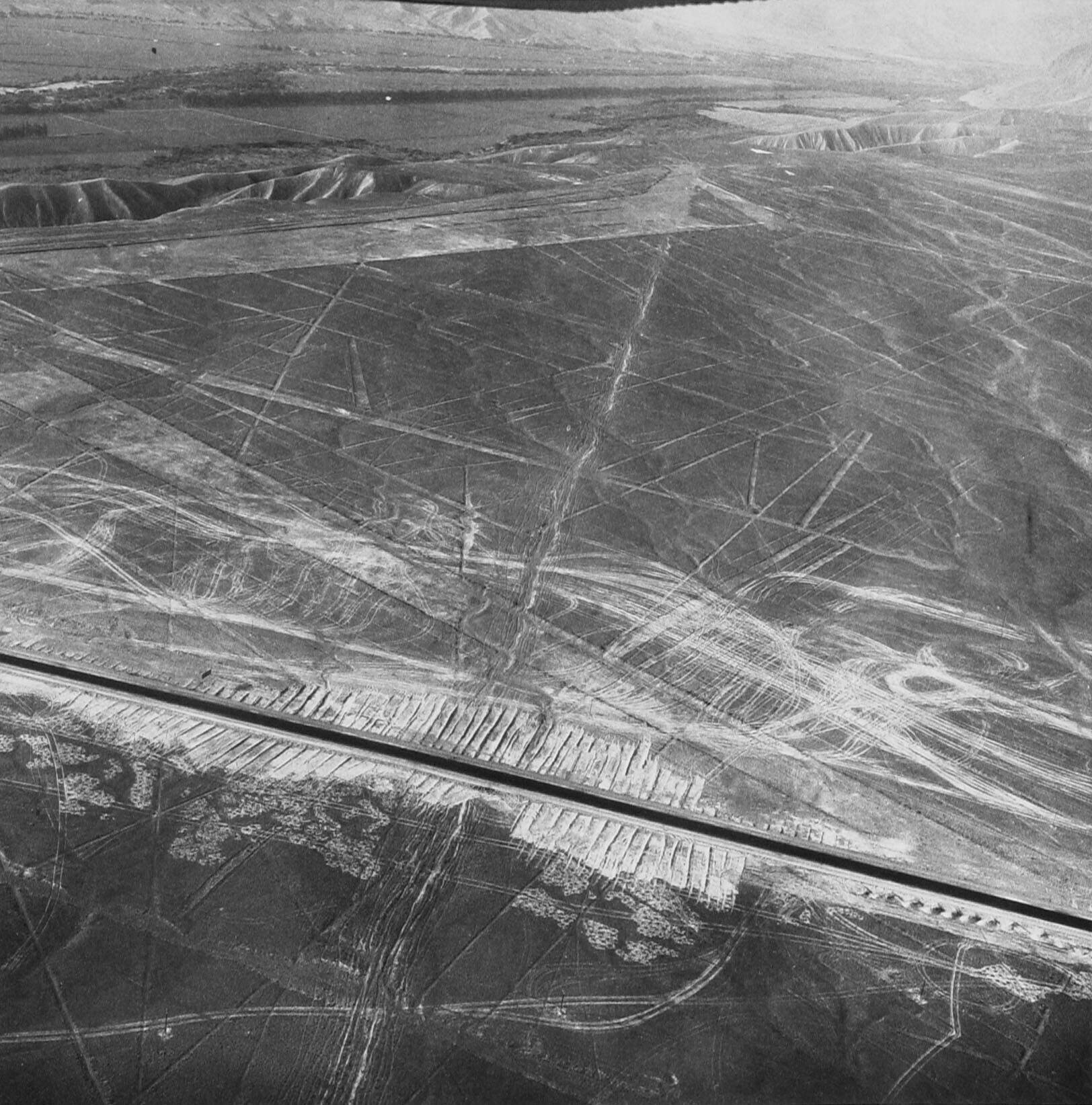 Luchtopname van de Nasca lijnen in het woestijn gebied. De Panamericana, de bulldozer en autosporen die de Nasca lijnen doorsnijden