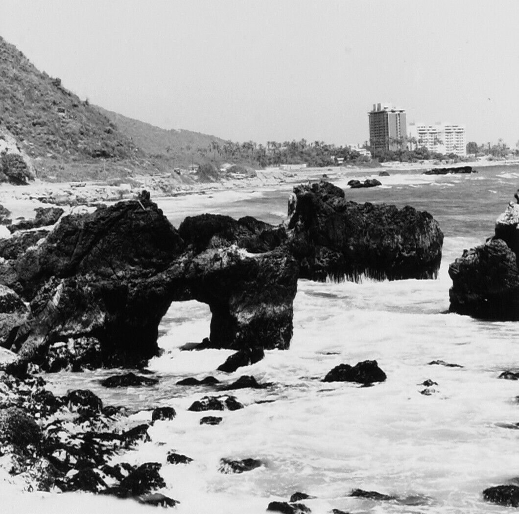 Rotsformatie aan de kust ten noorden van Caracas, bij Macuto, op de achtergrond moderne woonflats