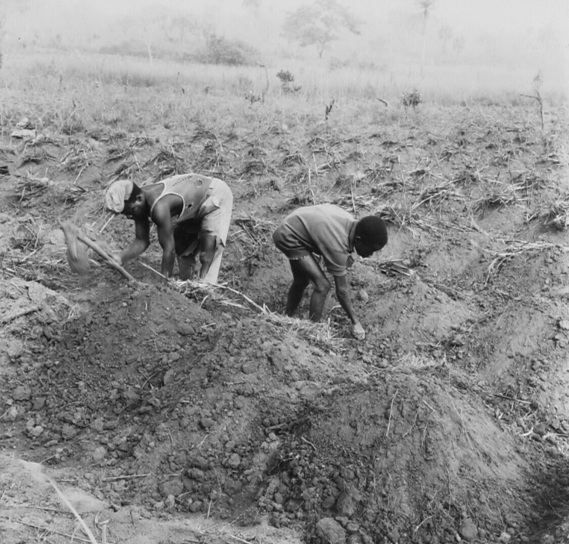 Het poten van de yam knollen op een veld