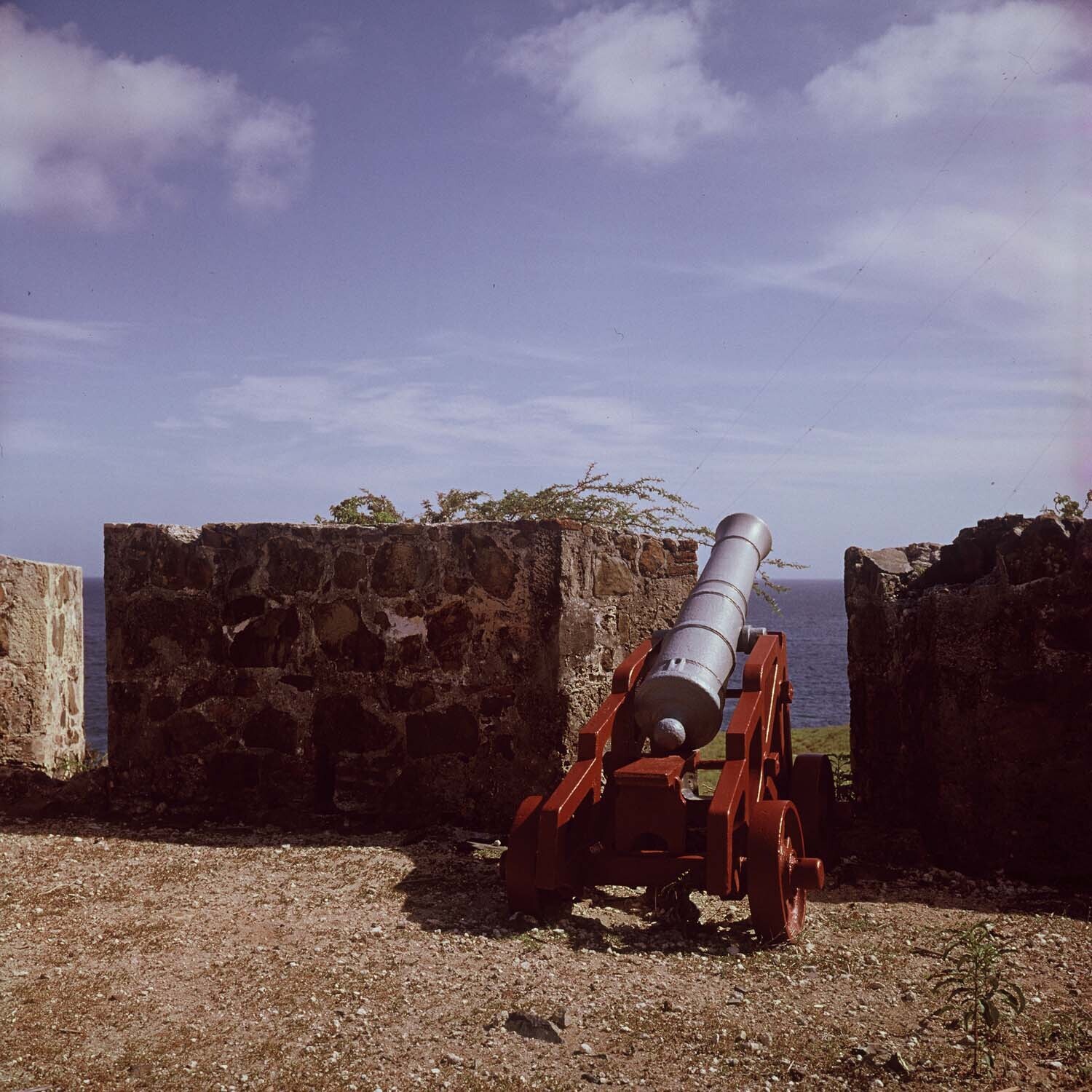 Oud kanon op Fort Amsterdam, gelegen tussen Grote Baai en Kleine Baai