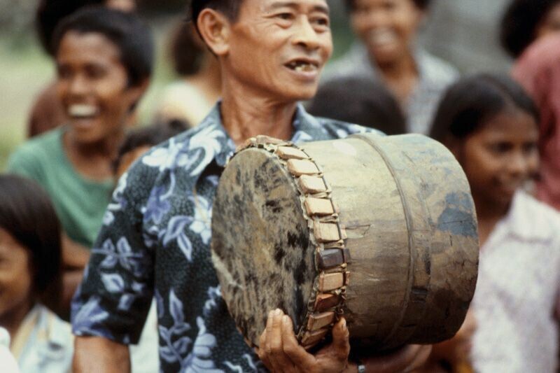 Een kleurendia van het bespelen van een trom tijdens touwtrekwedstrijden in Ullath, Saparua.