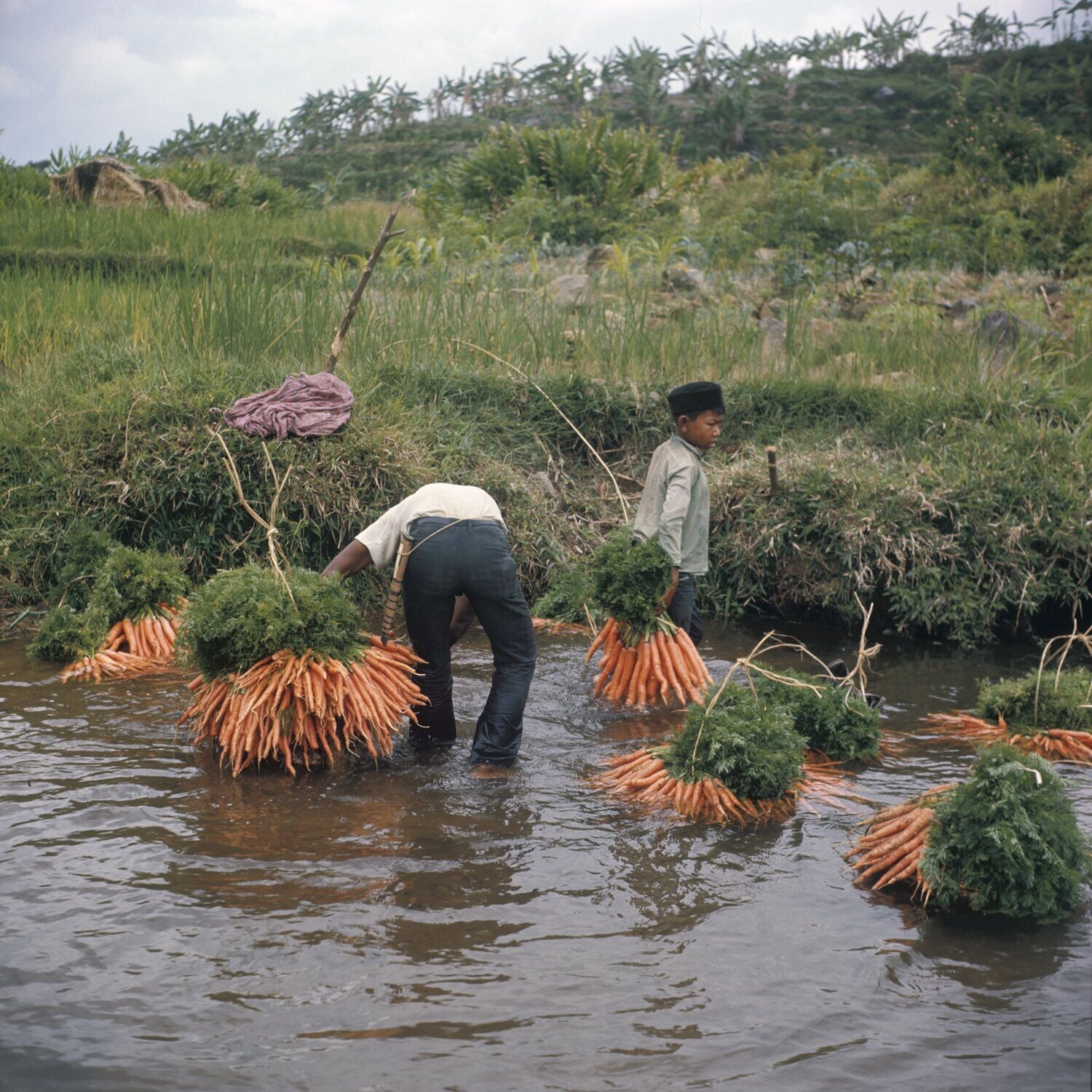 Het wassen van bossen wortelen in de rivier