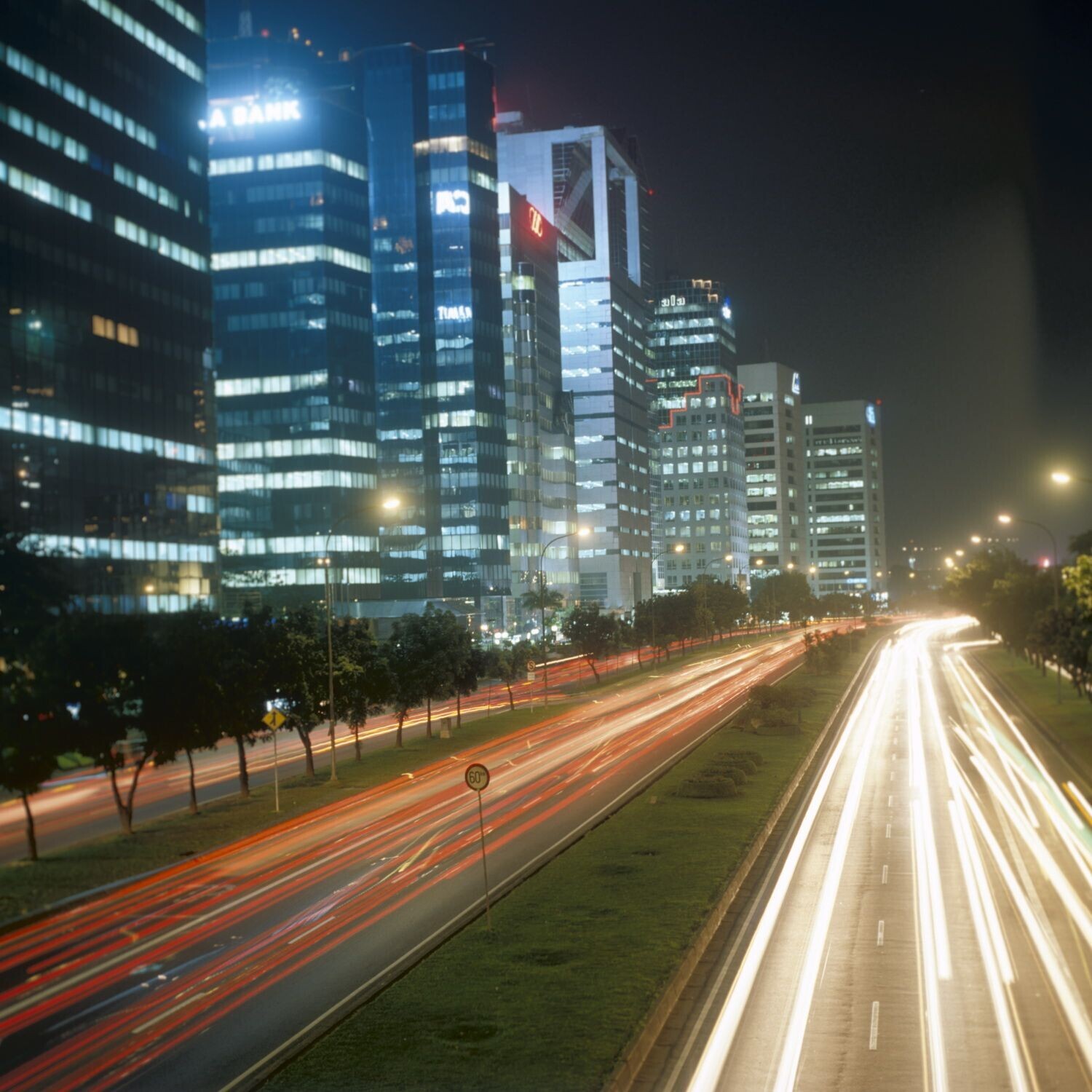 Het centrum van Jakarta in de avonduren, met kantoren en hotels