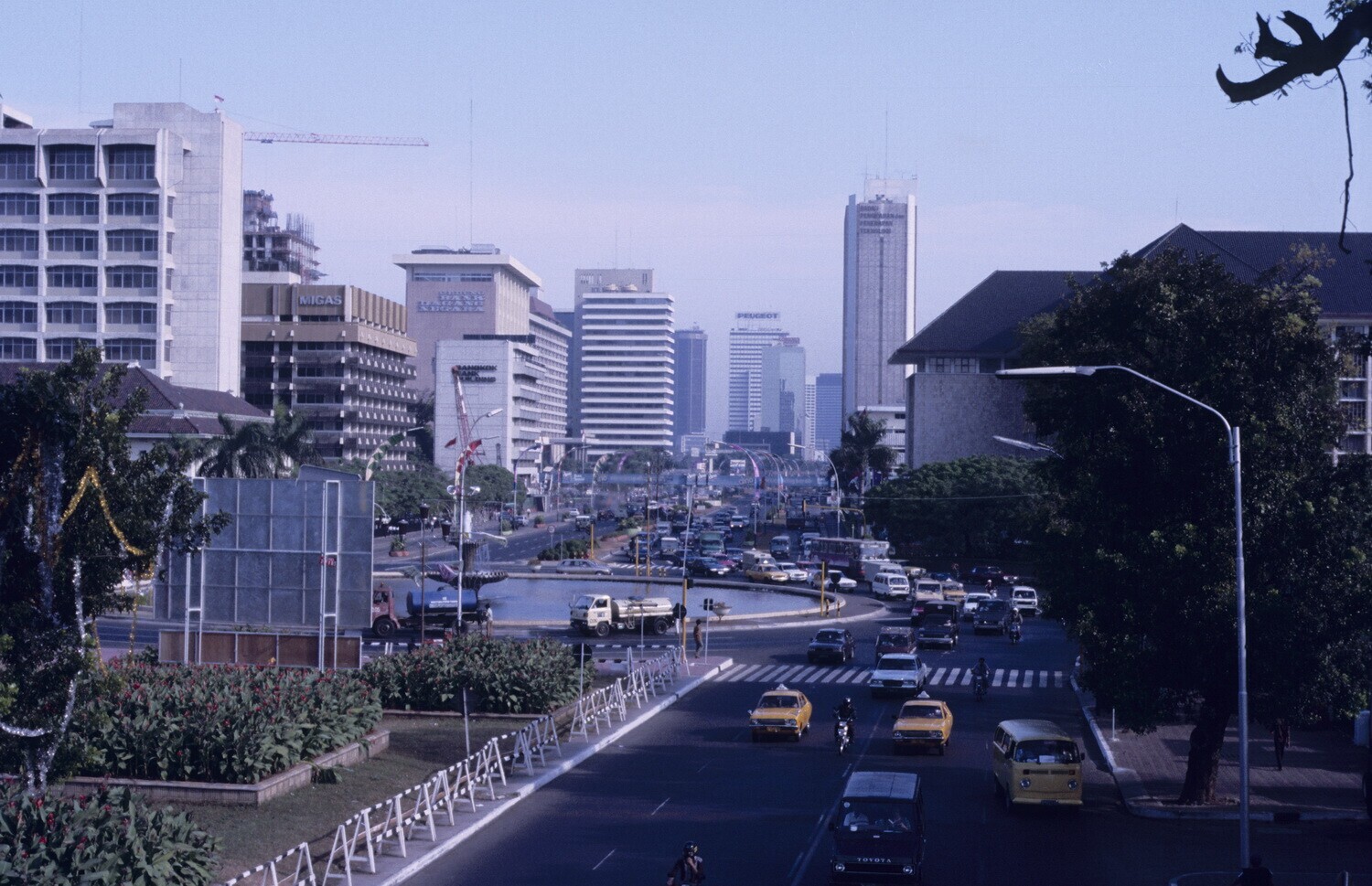 Straatbeeld van de Jalan Mèrdeka Barat genomen vanaf de loopbrug in de richting van de Jalan Thamrin.