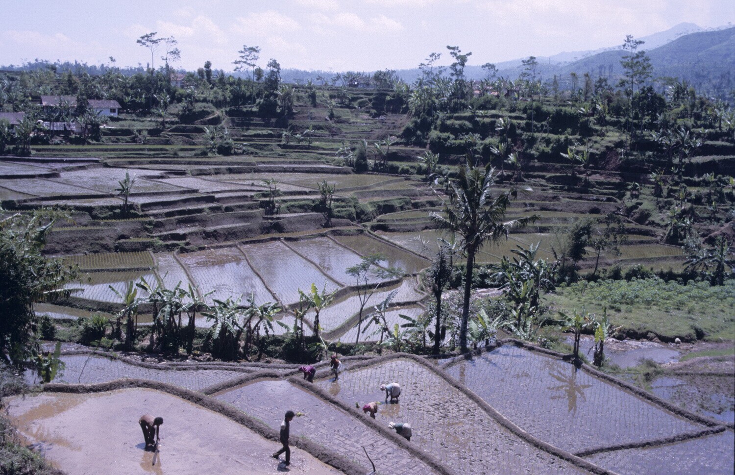 Het uitplanten van Bibit ( jonge rijstplantjes) door vrouwen op de sawahterrassen in Midden Java.