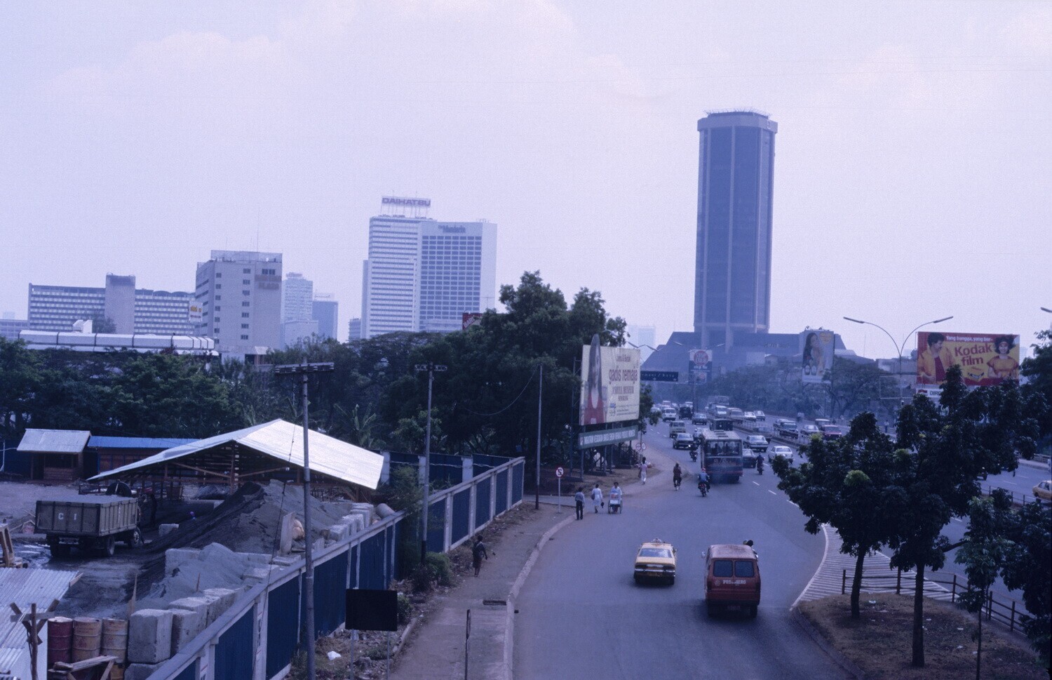 'De Jalan ''Imam Bonjok''. Het hoge donkere gebouw is momenteel het hoogste gebouw van Jakarta, de bank ''Bumi Jaya''.'
