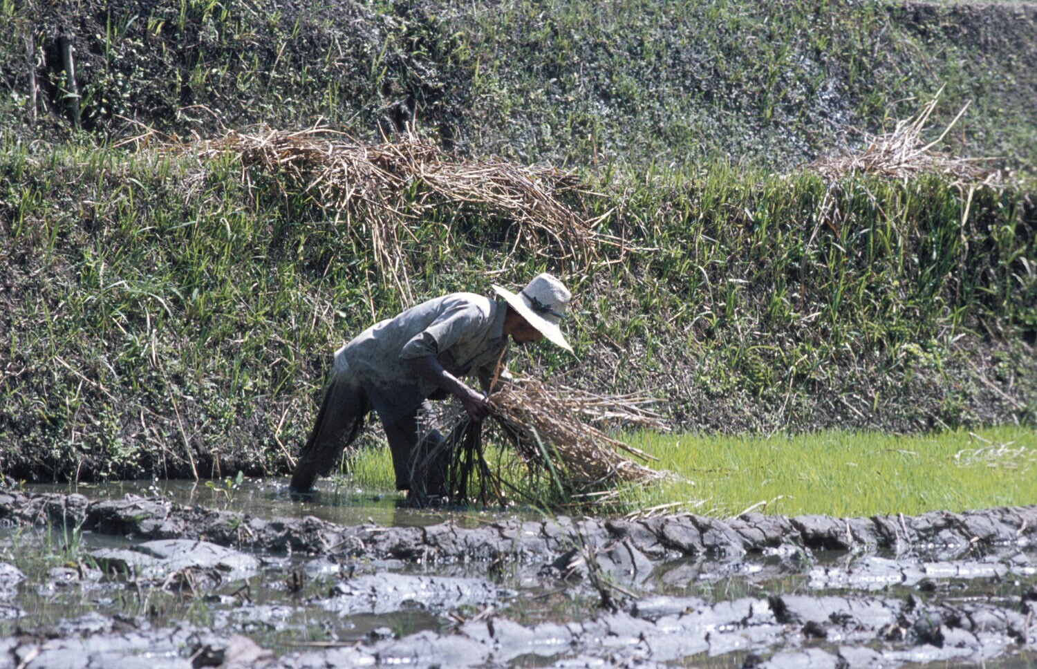 Man maakt een rijstveld schoon van plantenresten, omgeving Cililin, Wst-Java.