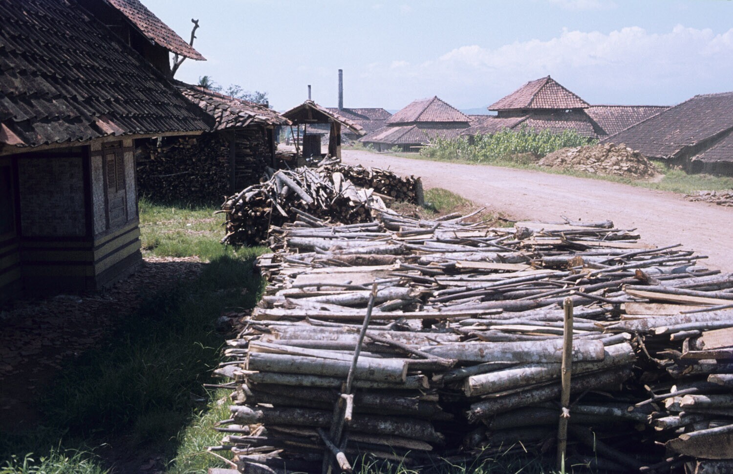 De stapels brandhout, die gebruikt wordt in steenfabrieken te Plered, West-Java.
