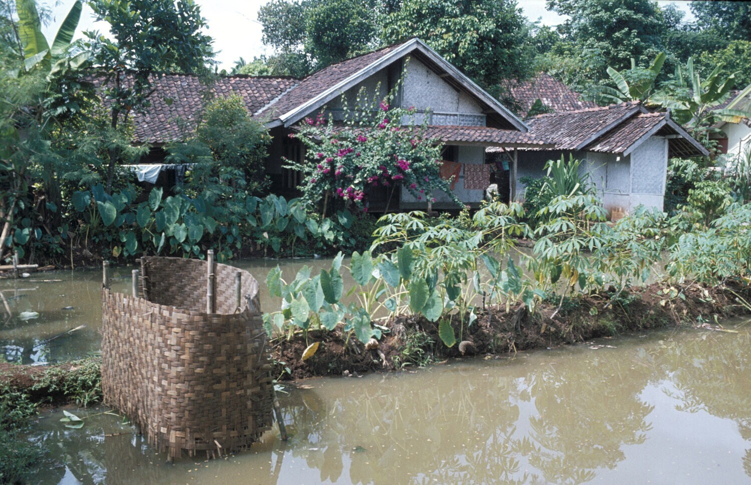Woningen met wc (zgn. kakus) boven de visvijver, Plered, West-Java.