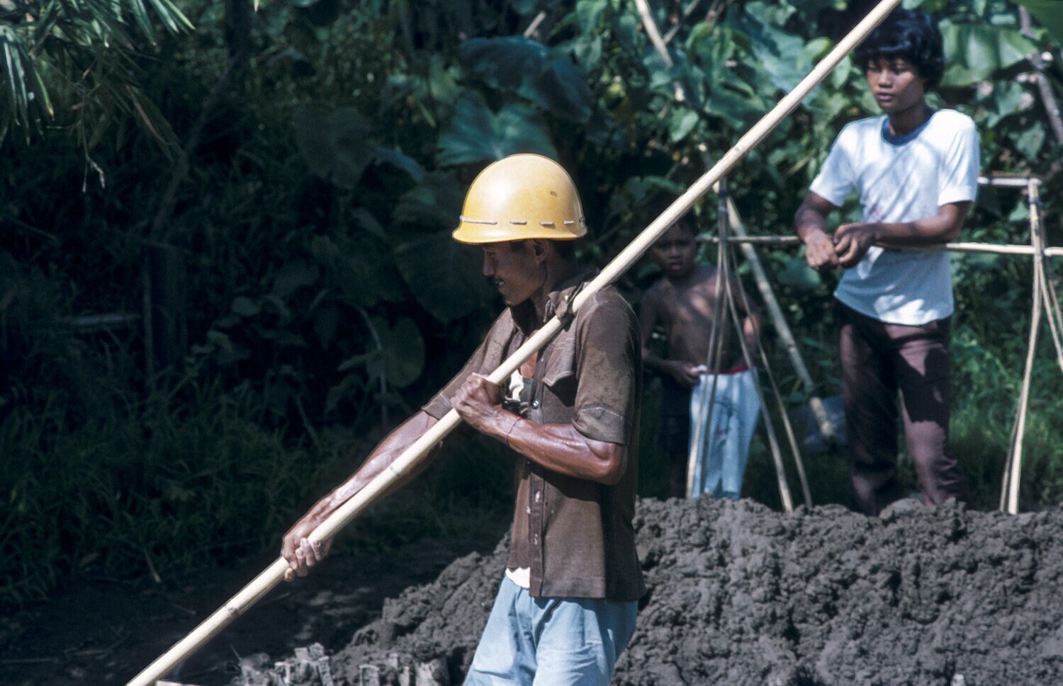 Mannen die metselzand uit de rivier verzamelen, Cikaobandung, Jatiluhur. West-Java.