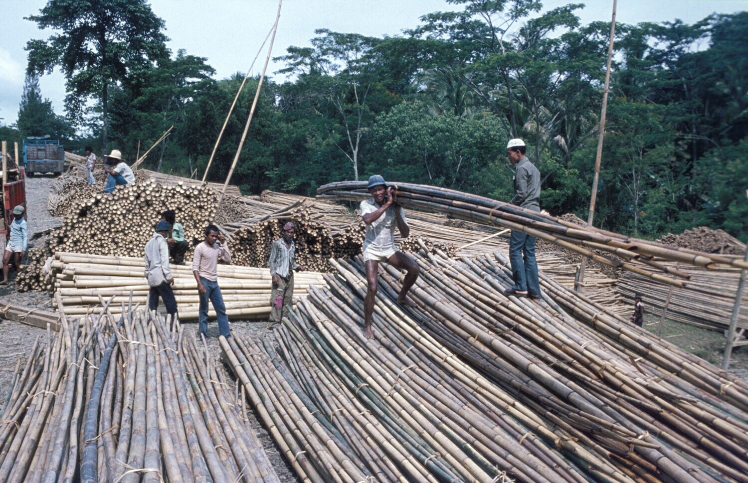 Bamboe-overslagplaats langs het Jatiluhun-meer. Van hieruit wordt bamboe per vrachtwagen getransporteerd naar o.a. Jakarta en Bandung om verwerkt te worden voor allerlei doeleinden zoals huizenbouw, meubelindustrie, vlechtwerk, enz. West-Java.