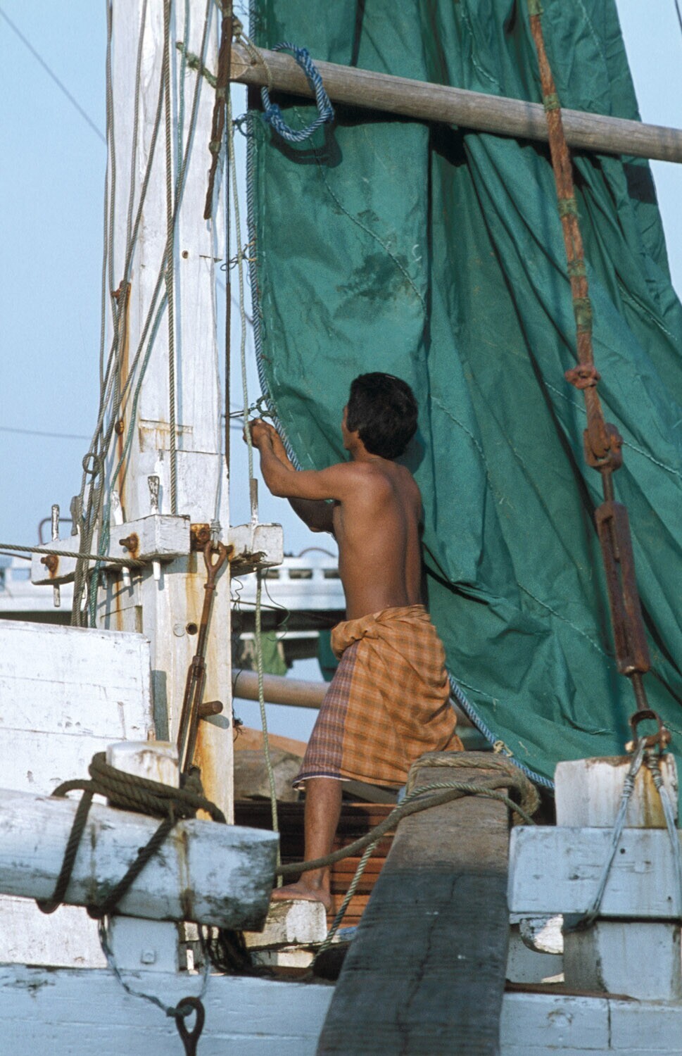 Man in de weer met een zeil aan boord van een Buginese prauw in de haven Sunda Kelapa