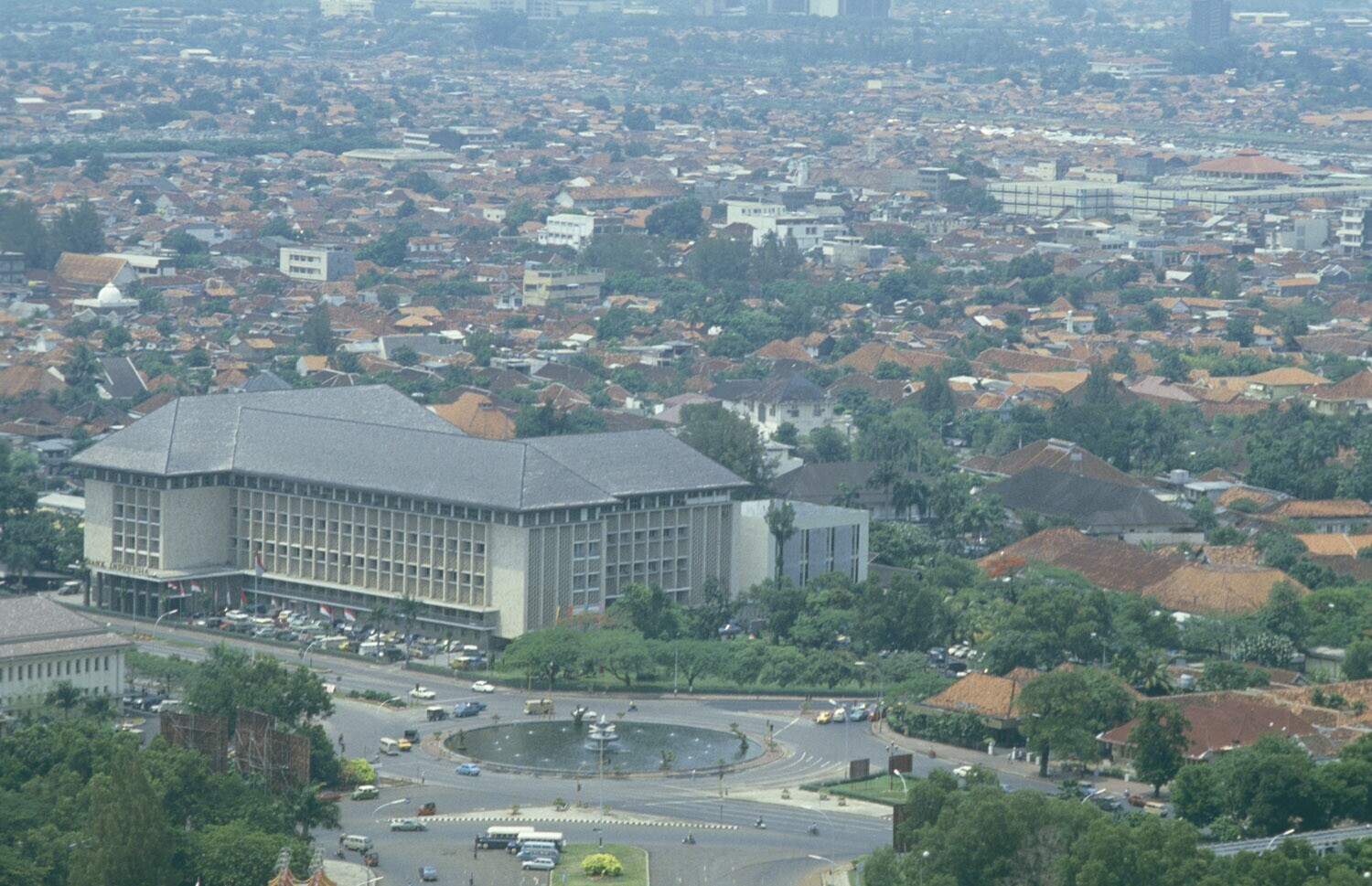 Gezicht op Jakarta met op de voorgrond het gebouw van de Bank Indonesia.