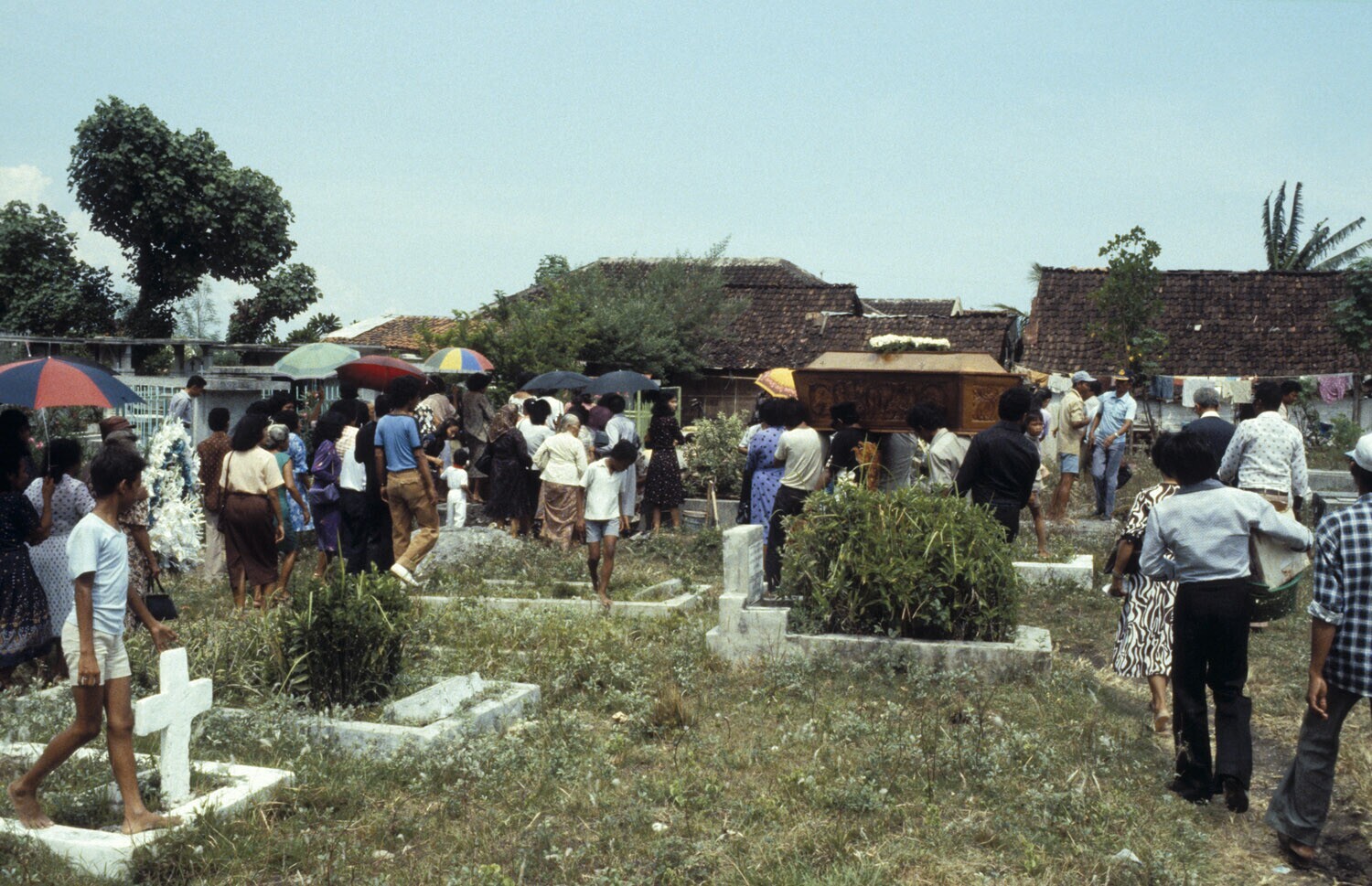 De kist van de overleden heer Pattiselano wordt op het kerkhof naar het graf gedragen. Surabaya, Oost-Java.