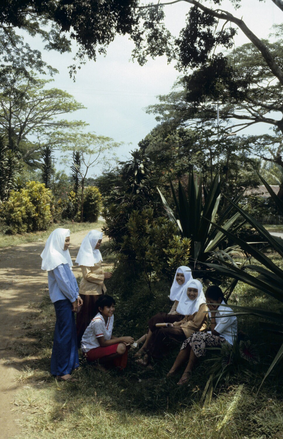 Moslim-meisjes aan de kant van de weg, Singosari, Oost-Java.