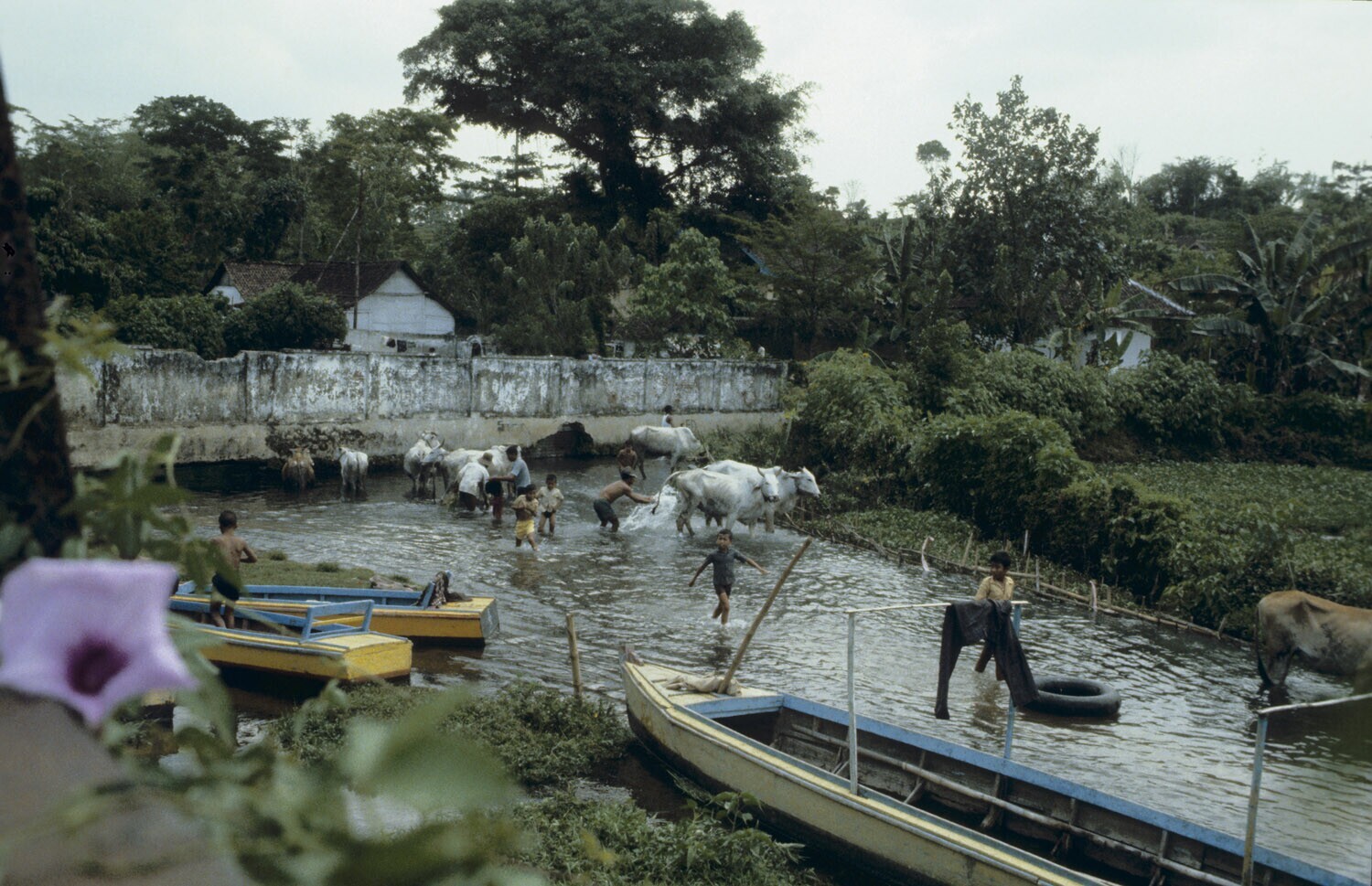 In de bronnen buiten het zwembad van het uitgaansplaatsje Wendit bij Malang, Oost-Java, wordt het vee gewassen.