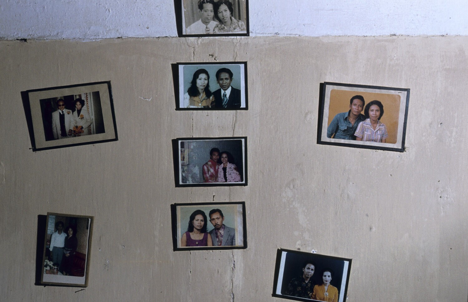 Familiefoto's aan de wand van een huis in het Ambonkamp in Ujung Pandang, Sulawesi.