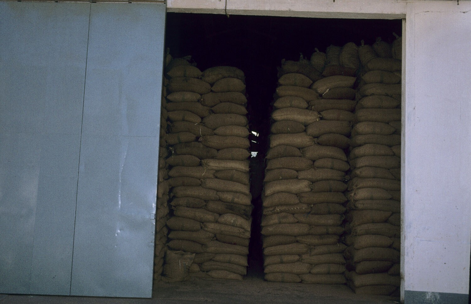 Opslag van copra in zakken in de Binoli cocosfabriek, Bitung, Sulawesi.