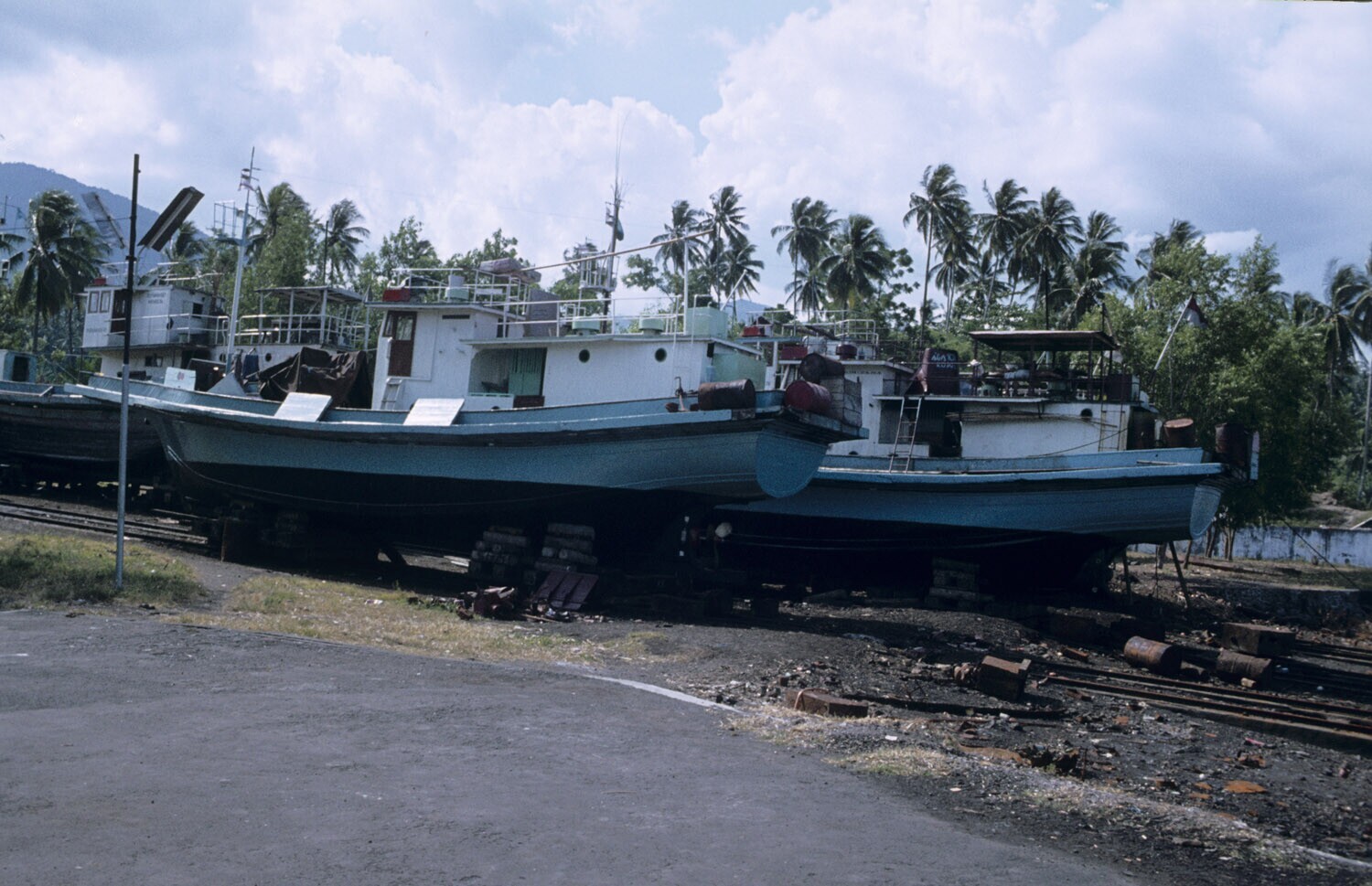 Tonijnvissersboten voor reparatie op de werf in de haven van Bitung, Sulawesi.