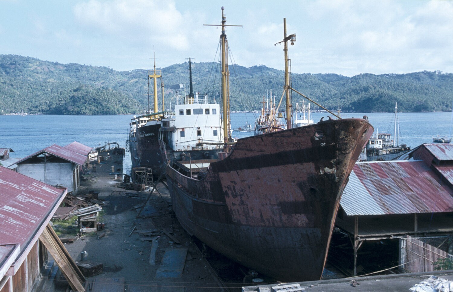Op de werf in de haven van Bitung, Sulawesi liggen coasters voor reparatie.