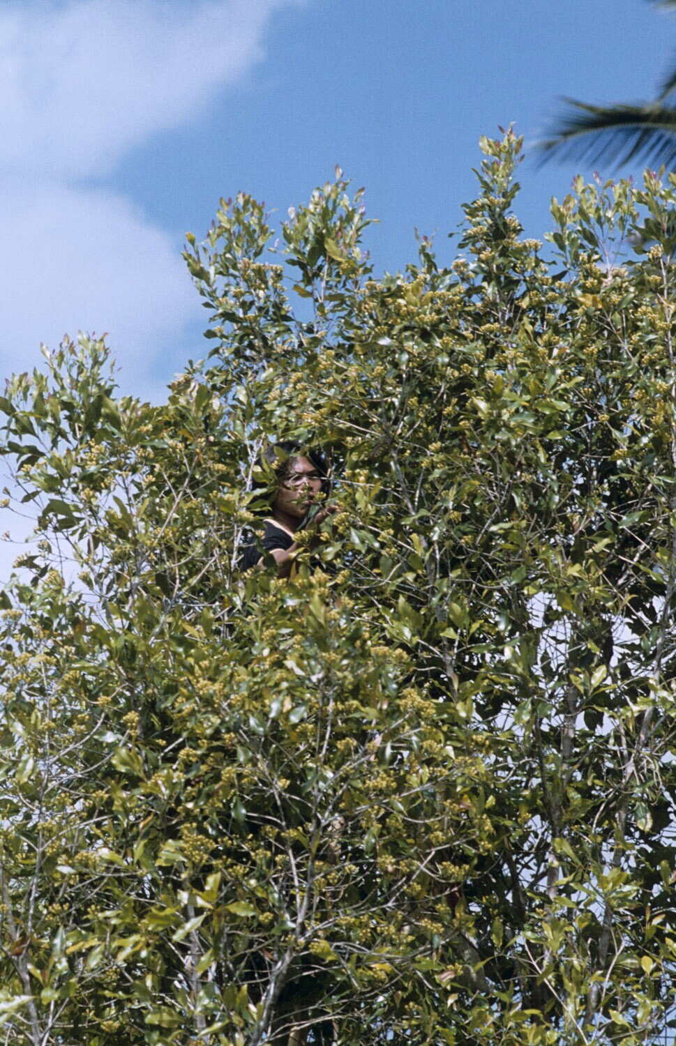 Man zit in de top van een kruidnagelboom, om de kruidnagels te oogsten. Tondano, Sulawesi.