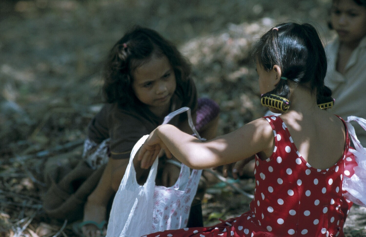 Kinderen helpen bij de kruidnageloogst door de gevallen kruidnagels op te rapen. Tondano, Sulawesi.