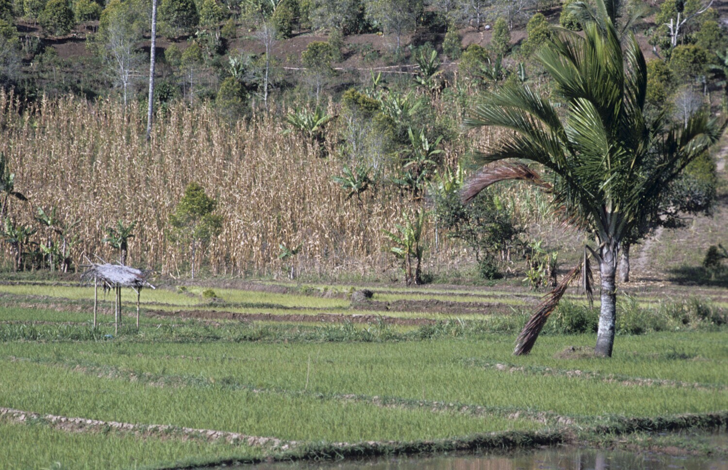 Rijstvelden met op de achtergrond jonge kruidnagelboompjes tegen de heuvel, Tondano, Sulawesi.