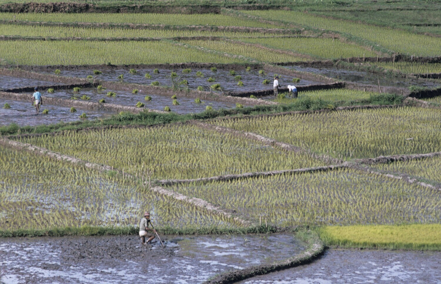 Rijstvelden waar mensen aan het ploegen en aan het uitplanten zijn. Tondano, Sulawesi.