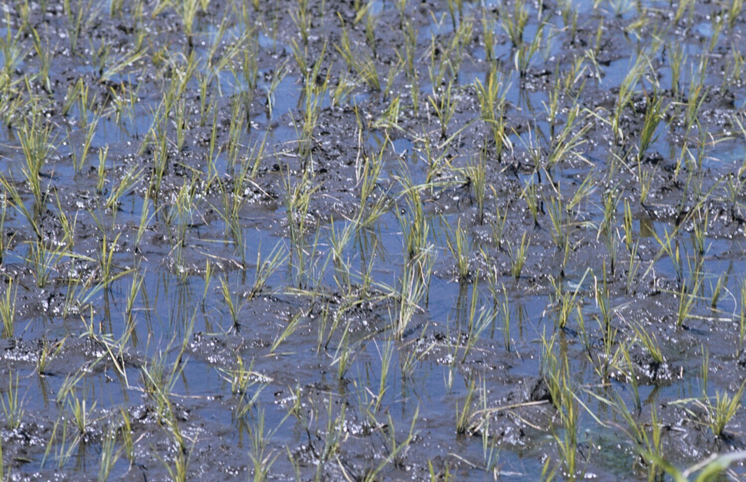 Pas uitgeplante rijstplantjes in de sawah, Tondano, Sulawesi.
