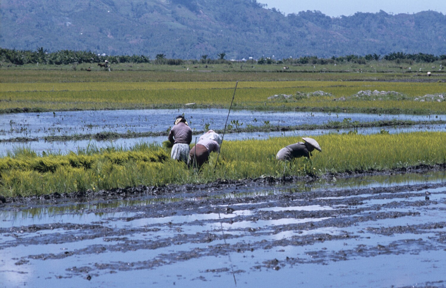 De rijstbibit, kleine rijstplantjes, worden hier uit het zaaibed gehaald om uitgeplant te worden in de sawah. Tondano, Sulawesi.