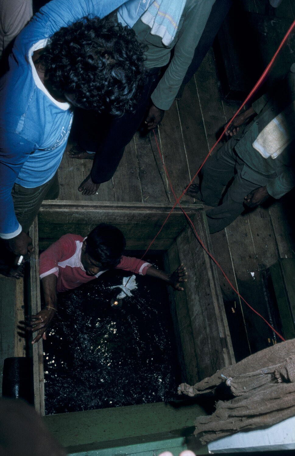 De bun van een tonijnvisser voor de aasvisjes Ikan poeri is duidelijk te zien. Tulehu op Ambon, Molukken.