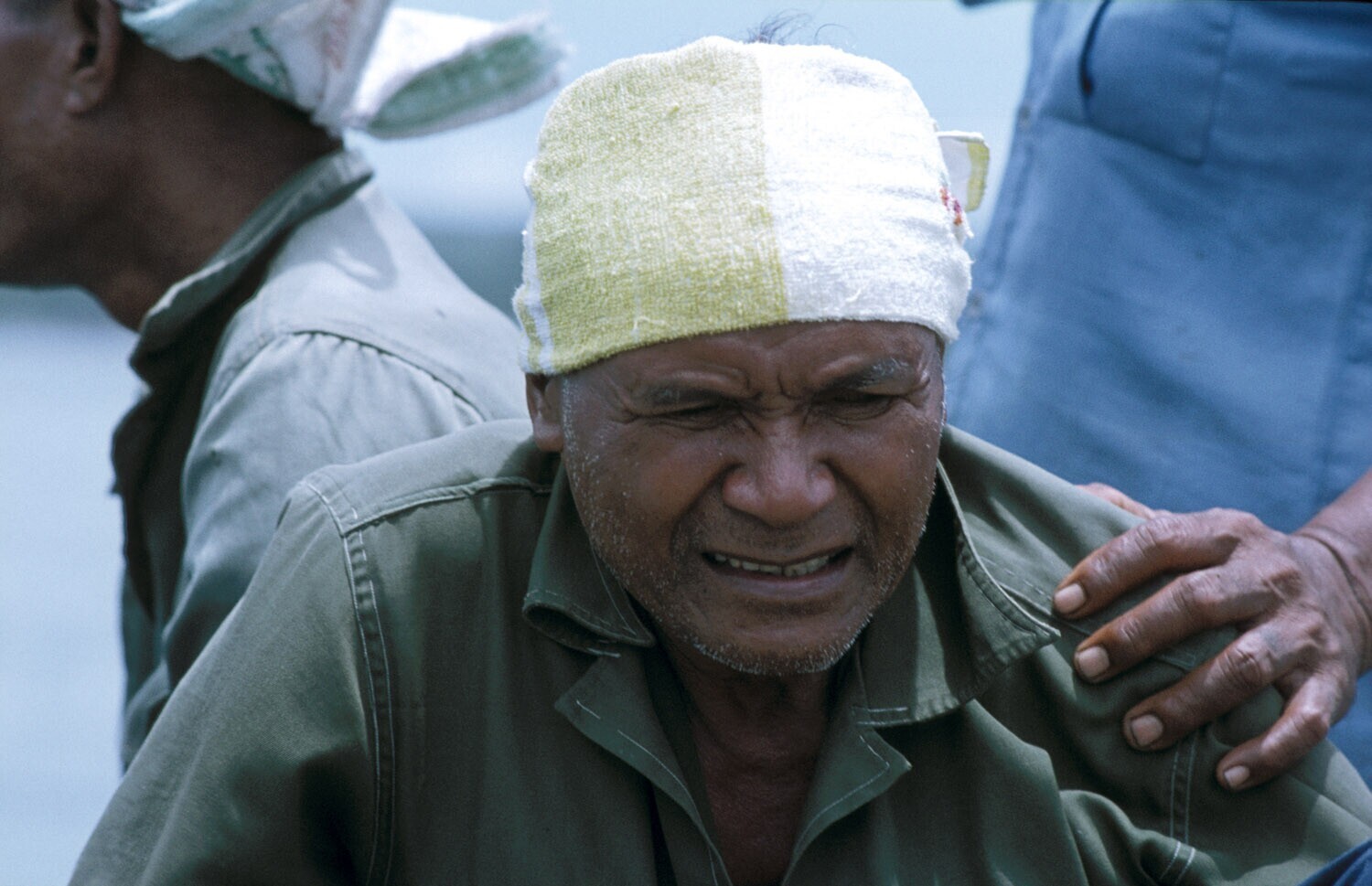Close-up van een visser, Tulehu op Ambon, Molukken.