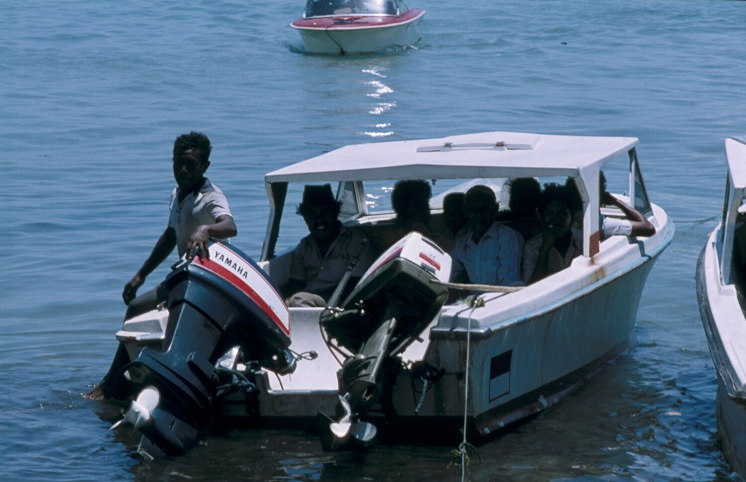 Een speedboot met twee motoren die transport verzorgd tussen de verschileende eilanden van de Molukken.