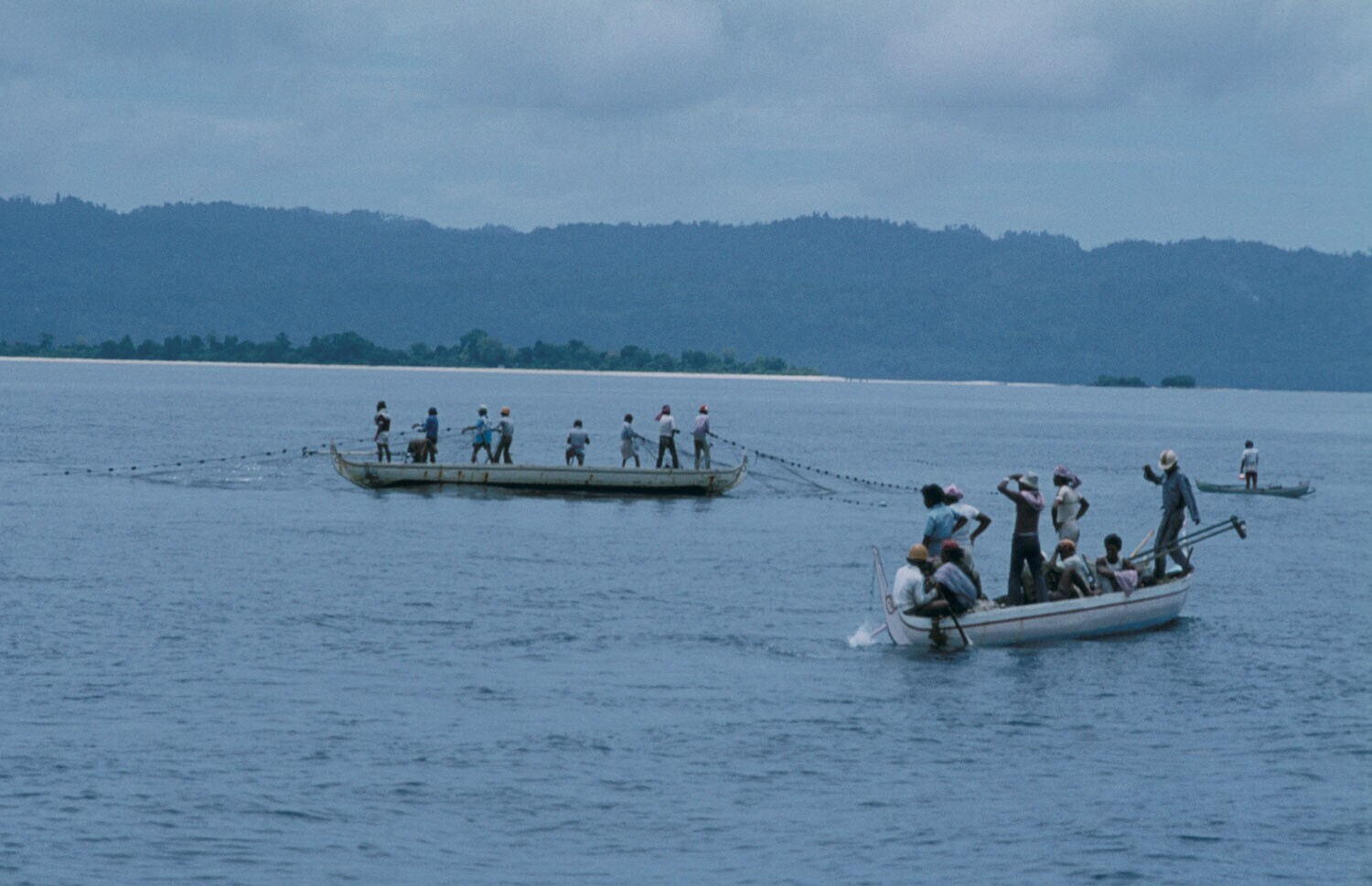 Het vissen in ondiep water langs de kust met een groot net. Tulehu op Ambon, Molukken.