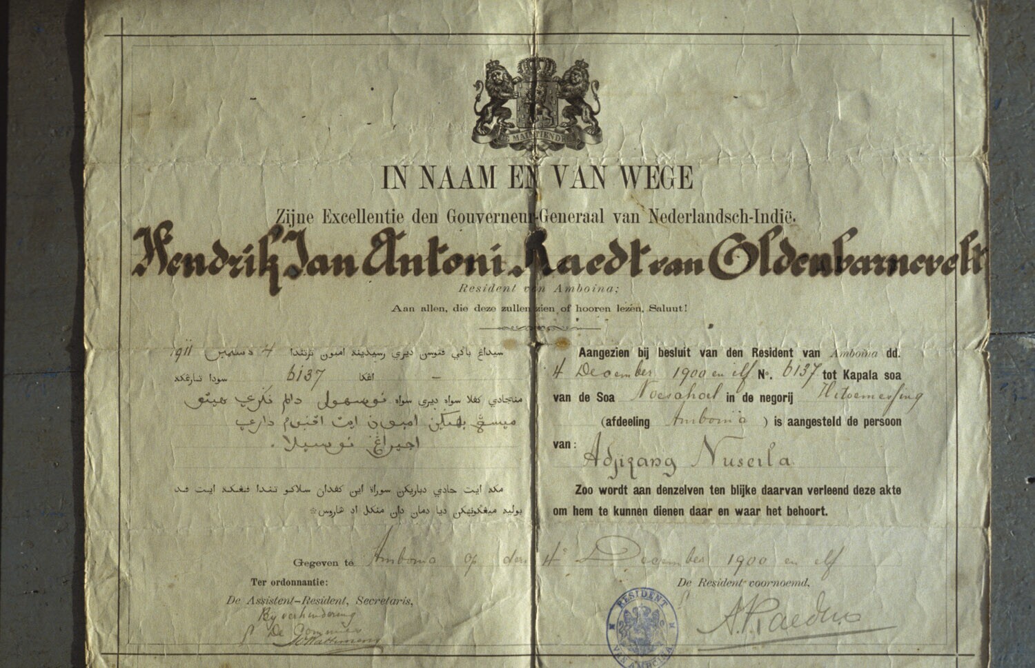 Oud regeringspapier/vergunning uit Hitu Messing op Ambon, Molukken.